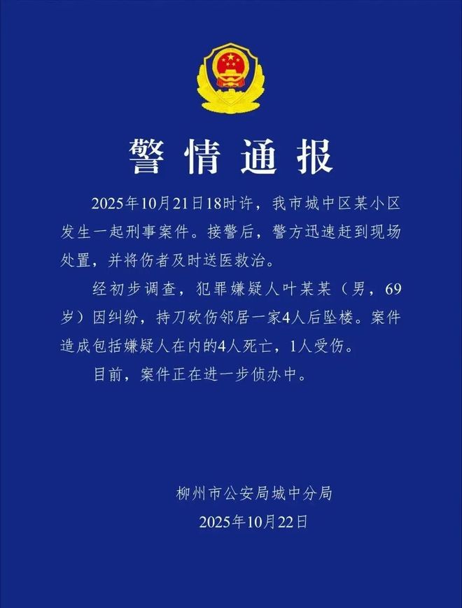 晚上六点,正当各家各户都在做饭吃饭的时候,一小区突然发生了一起恶性案件。一名69岁男子,有6年前的犯罪前科,再次持刀刺向邻居。但这一次的结果却是四人丧生。它以打斗和冲突开始,却以四条生命结束。 10月22日凌晨,广西柳州市公安局市分局发布警方通报:2025年10月21日18时左右,该市城中区一社区发生一起刑事案件。接到报警后,警方迅速赶赴现场处理事件,并及时将伤者送往医院救治。经初步侦查,犯罪嫌疑人叶某某(男,69岁)因争执持刀刺伤邻居一家四口,后从楼上坠落。该案件已造成4人死亡,其中包括他怀疑,造成1人受伤。目前,案件正在进一步审理中。报道只有短短几行字,但记者前往现场采访后,更多细节浮出水面,越读越揪心。案发时间是晚上6点,当时大家下班回家准备吃饭,小区里人也很多。突然有人大喊“杀手”。居民王女士跑到窗前,看到一名男子躺在地上,身上有很多血迹。他害怕了,连忙关上了窗户。当警察和救护车到达时,你已经从大楼上摔下来,气喘吁吁。遭受酷刑的四名邻居被紧急送往医院,但最终,其中三人的生命没有保住。剩下一名仍在重症监护室,生命体征不稳定。最让人意想不到的是,这已经不是叶某某第一次因伤而闹事了。用刀砍人。有人正在挖掘六年前的记录。 2019年8月,他因一些小事发生争执。别人先打了他一拳。随后,他拿起菜刀刺向该男子,在该男子的嘴角和额头上留下了开放性伤口。随后,警方对其处以罚款500元,拘留10日,并没收菜刀2把。当时谁能想到六年后他会持刀袭击邻居呢?小区居民的说法更让人尴尬。有人说,叶某某平时性格有些孤僻,不愿意和别人说话。从未见过他对受害邻居发出任何噪音。大多数情况下,他偶尔会打架,没有人认真对待他。但受害人家属在该社区生活多年,与人相处十分友善。听说家里有老人和小孩,很伤心又走了。今天社区里的气氛十分凝重。许多人彻夜未眠。当人们走进那所房子的门时,会感到不舒服。警方表示,他们排除了由邻里冲突引起的复杂动机,例如爱情和谋杀。具体原因仍在调查中。但网友们的讨论却炸开了锅。一位网友坦言:“半个月我和邻居因为空调漏水发生了争执,后来找物业公司协调安装了水盘。这到底有多大仇恨啊,竟然拿刀杀人?最后两个家庭都破碎了,不值得。”这确实说到点上了。邻里之间能有什么仇恨呢?无非是一些琐碎的事情,比如噪音、公共场所的使用和宠物。但即使是这些小事,如果不解决,真的可能成为“定时炸弹”。尤其是老年人,有时很容易陷入困境脾气暴躁,很容易被小事冲昏头脑。会引导你,很容易走极端。有网友表示,家里的长辈有时会因为楼上脚步声大而生气。在katunthere,这不是问题,但是他们自己要考虑一下,而且他们更多地考虑的是,这种愤怒。现在警方已经增派警力到社区巡逻,社区也在安抚居民情绪。然而,死者一去不复返,生者仍要面对破碎的家庭和心理阴影。这场悲剧确实给大家敲响了警钟:邻里之间不打架怎么能和睦相处呢?但无论问题有多大,都不要走进死胡同。如果您认为自己不能解决问题,可以向物业管理公司、社区或警方求助。总有理由的余地,所以不要冲动。毕竟“远亲不如近邻”这句话已经存在很长时间了,这并不是没有原因的。我们都住得很近,应该互相帮助。即使发生冲突,每个人都应该退一步。但柳州这起案件,某某一时冲动,毁掉了两个家庭,他的下场也是如此。他在做什么