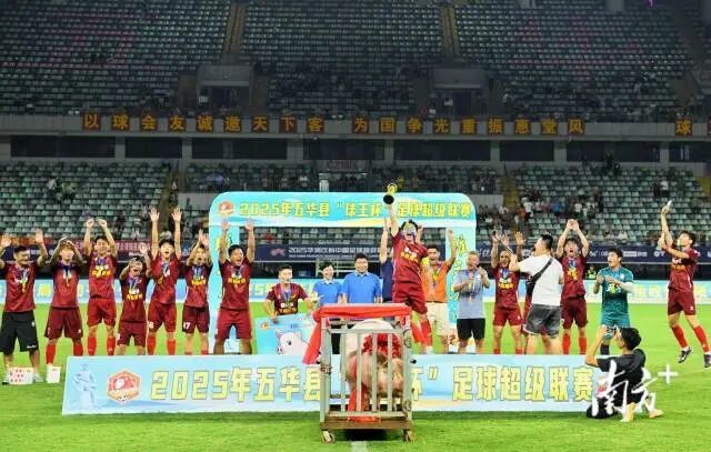 10月12日晚,素有“县超联赛”之称的2025年五华县“足王杯”足球超级联赛落下帷幕。横陂队获得了冠军,奖品是一头重达400公斤的大肥猪。 10月13日,相关视频在社交平台疯传,引发网友热议。有网友调侃,“真是万事如意的‘猪’啊。” “其他人赢得了冠军并捧起了奖杯,但他们却通过‘举起猪’来庆祝。” “冠军猪不仅重,而且‘上镜’。我还是第一次见到这样有仪式感的奖项。 ”五华“县超联赛”冠军合影。据南方+视频画面显示,这头大猪被装进特制的笼子,推到了众多工作人员的区域中央。获奖团队成员与“奖品”合影庆祝,全场掌声不断。据媒体报道,五华C广东省梅州市,是中国现代著名足球运动员、“亚洲足球王”李华党的故里。 10月15日,上游新闻记者(baoliaosy@163.com)联系五华县文化广电旅游体育局了解此事。工作人员陈先生说:“每年的奖品都不一样,今年的冠军奖品是一只猪,这只猪不仅象征着丰收、喜悦,还寓意着‘财源广进’,也代表了五华足球在当地扎根、延续传统文化特色、亲民化。”冠军的奖品是一头猪。图片 据南方+了解,“县超联赛”是一场全民参与、免费观看的乡村地方足球比赛。已有22年的历史。他说:“今年的‘足球之王’杯’是自2003年以来的第22届,决赛现场观众人数超过10000人。整个活动不收门票,所有资金均由当地公司赞助。对于“足球之王杯”赛事名称的由来,陈先生表示,五华县足球环境浓厚,是“亚洲足球之王”李胡良的故乡。据梅州市官网介绍,李惠廷是中国现代体育史上著名的足球运动员,出生于五华县横陂镇,17岁开始足球生涯。 他活跃于1920年代和1930年代的亚洲足坛,被公认为当时的“中国足坛第一人”。上游新闻记者 冯盛勇