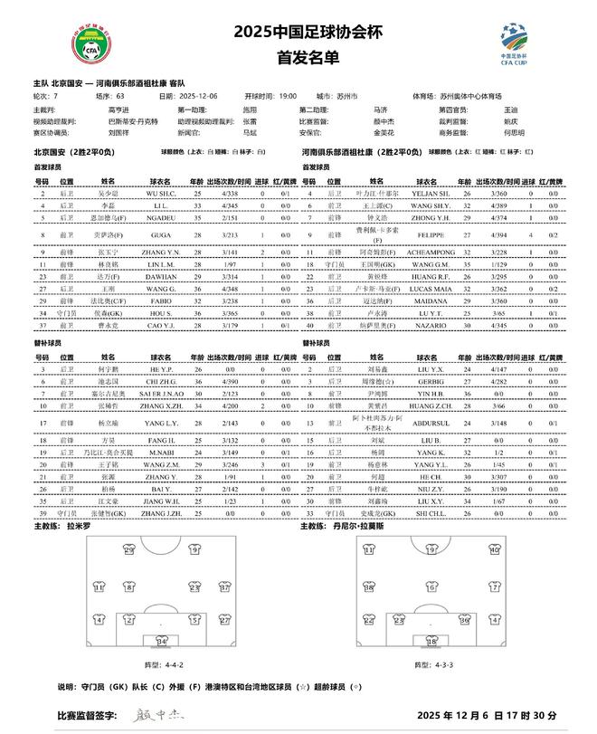 12月6日晚,备受瞩目的2025年足协杯决赛在苏州奥体中心体育场拉开帷幕,北京国安队与河南队争夺冠军。赛前,两队的首发阵容已经公布。北京国安方面,代理主教练拉米罗安排了四名外援首发,分别是:恩加德乌、贡萨洛、达万、法比奥。其中,刚刚拿下中超“金靴”的法比奥担任队长;门将依然是老将侯森。其他位置包括:吴少聪、李雷、张玉宁、林良铭、王刚、曹永靖。替补席上,何宇鹏、池忠国、塞尔吉尼奥、张稀哲、杨立瑜、方浩等球员随时待命。河南队方面,主教练丹尼尔·拉莫斯安排了五名外援一起首发,特别是:费利佩·卡多佐、阿奇姆·彭、卢卡斯·马亚、迈达纳、纳扎里奥;王尚元曾担任场上队长由王国明担任守门员,叶力江施纳尔、钟义豪、黄锐峰、卢永涛一同出战。替补席上出现了刘益新、周元德、尹鸿博、黄紫昌等球员。本场比赛共安排了6名国际级裁判。其中,主裁判为来自韩国的高恒进,第一助理裁判为来自江苏的石翔,第二助理裁判为来自湖北的马季,第四裁判为来自上海的王迪,助理视频裁判为来自德国的巴斯蒂安·丹克特,助理视频助理裁判为来自天津的张雷;主裁判是来自山东的姚庆。此役,双方都对冠军充满渴望;如果北京国安获胜,这将是他们第五次夺得足协杯冠军;如果北京国安获胜,这将是他们第五次夺得足协杯冠军;如果河南队获胜,这将是球队历史上的第一次。那么,在胜败已定的背景下,谁能笑到最后呢?答案即将揭晓。本场比赛在中央电视台体育频道(CCTV5)、北京广播电视台体育休闲频道等平台进行了现场直播。