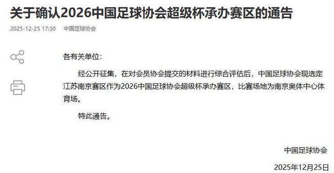 北京时间12月25日,中国足协正式宣布,2026年中国足协超级杯将在赛区举办。 2025年中超联赛冠军与足协杯冠军将争夺新赛季首个冠军。今天下午,足协在官网发布通知称,经综合审核各会员协会提交的材料,最终选定江苏省南京赛区为2026年中国足协超级杯的主办地区。比赛地点为南京奥体中心体育场。根据足协11月20日公布的2026年比赛日历,明年的超级杯将于2月28日举行。作为新赛季的首个冠军,争夺的双方分别是2020年中超联赛冠军上海上港队。025赛季,与北京国安队,获得足协杯冠军。近日上港迎来了20岁生日,他们甚至还得到了国际足联主席因凡蒂诺的祝福,可谓是卡满了。赛季结束后,上港发起的第一个变动是助理教练阿洛伊西离队,前往浙江队担任一线队主教练。阿洛西是上港联赛三连冠的关键人物之一。上港队对阿洛西宣布离任做出的贡献给予了高度认可,特别强调了他对球队定位球战术的设计和部署。阿洛伊西的离开是否会给球队带来影响,可以在本届超级杯中得到检验。新赛季引援方面,根据此前报道,山东泰山队的陆永涛、浙江队的岳鑫、青岛西海岸的杨曦、成都队的李阳。至于国安队,在夺得足协杯冠军后,球队再次换帅。代理头c主帅拉米罗已经担任中甲球队深圳青年队主教练,目前新任主教练很可能是蒙哥马利。赛季结束后,包括王刚、王子铭、张远等多名球员确认离队。招聘方面,梅州客家的茹子楠早早敲定。据称,外援网将加强中场和边路的招募。目前还没有更精确的目标。值得一提的是,为了备战2026年超级杯,国安将在苏州举行为期一周左右的集训。第一阶段冬训,国安将先前往海口集训两周,然后出国寻找对手进行热身赛。