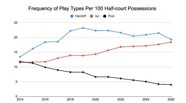 2019年12月,时任小牛主帅卡莱尔解释了不允许波尔津吉斯出任低位的原因,总结了新时代低位打法的尴尬处境。 “低位单打不再是一个好战术,这不是一个好战术。对于一个2.21米的家伙来说不是这样。这是一个低价值的进攻选择。我们必须意识到比赛已经改变了。”卡莱尔说道。事实上,在2010年代末期,NBA正处于一场重大的战略变革之中,低位单打是一个重大的牺牲品。 2013-14赛季,NBA平均每100个半场回合有11.8次低位单打,与面对面篮下单打和传球的频率大致相同。但自那以后,面朝上进攻和交接球的频率增加了 50% 以上,而低位进攻则减少了三分之二,到 2025-26 赛季每 100 次半场进攻只有 4.0 次。然而,2020 年代中期出现了显着的逆转。用卡莱尔的话来说,游戏规则再次发生了变化:曾经被谴责为低效的东西现在,低价值打法已经成为这项运动中最好的半场进攻,比劈叉更好,比传球更好,甚至比旧的挡拆更好。低位是约基奇、本亚马和坎宁安等球星展示精湛脚步和一对一统治力的工具。而且,这也是击败现代防守并赢得比赛的一种方式。 “当你知道如何正确使用它时,”德罗赞说,“低位投篮是致命的。”离开小牛队后,波尔津吉斯随凯尔特人队赢得了总冠军戒指。近几个赛季,他的低位打法已经成为教练组不可忽视的宝贵武器。坐在摩根老鹰队的更衣室里,当被问及他六年前的激烈演讲时,卡莱尔咧嘴笑了。 “我记得那次采访,卡莱尔是对的。” 2019-20赛季,当波尔津吉斯单打完成投篮、制造犯规、失误或传球时,小牛队场均得分仅为0.92分,在46名得分低于10分的球员中排名第37位。最多 100 次低位单打。但近年来,在华盛顿、波士顿和现在的亚特兰大,波尔津吉斯大大提高了他的低位技术并掌握了制造犯规的技巧。自2022-23赛季开始以来,波尔津吉斯每次背身单打得到1.26分,这是同期完成至少200次背身单打的54名球员中效率最高的。 “如果(卡莱尔)现在这么说,”波尔津吉斯说,“他可能是错的。”虽然波尔津吉斯的身体是最极端的例子,但背身单打效率的提高是整个联盟的现象。在 2010 年代的前三个赛季,任何进攻(包括背身单打)平均每 100 次机会只能得到 89 分。然而,进入2022-23赛季,这个数字是每100次机会得到103分,比整体半场进攻平均得分高出约4分。本赛季,差距更大:每100回合包含背身单打在内的进攻得分为10分3.9分,而半场进攻整体得分为99分每100回合得分.0,相差4.9分。换句话说:如果一支球队每100次半场进攻得分为103.9分,那么这支球队本赛季将排在NBA第五位。 So, should the NBA completely oppose antiquity? Nothing could be further from the truththere. "Only stars can do that!"当被问及应该信任哪些球员更频繁地发帖时,一位东部联盟高管表示。上赛季,只有约基奇的内线进攻命中率为联盟最低的5.7%。相比之下,联盟中面带单打(亚历山大)和挡拆控球(特雷杨)的领先者仅占各自进攻类型的2%。约基奇在很多低位进攻中占据主导地位,仅他一个人就能将全联盟的低位进攻效率每 100 回合提高 1.1 分。这个统计数据告诉我们NBA的一条铁律:在赛季中,球星遵循不同的规则,数据分析在考虑到球员的个人特征时效果最佳,而不是开出一成不变的规则。ize-fits-all strategycop to everyone. “如果你有优秀的球员,”活塞队主教练比克斯塔夫说,“你必须尽你所能让他们处于有利的位置,即使这可能与联盟其他球队的做法背道而驰。”亚特兰大老鹰队的情况就是这样,在斯奈德担任NBA主教练的10个完整赛季中,有9个赛季,该队的球队在低位单打频率上排名第25位或更低,上赛季老鹰队排名第29位。拥有波尔津吉斯之后,他必须考虑如何最大化拉脱维亚人的优势。尽管没有其他老鹰队球员场均背身单打次数超过1次,但拥有波神的老鹰本赛季背身单打次数排名第15位。大家都知道,新时代,中程投影正在逐渐消失。但总体来看,中距离数据的下降主要集中在角色球员身上,而亚历山大、杜兰特、布朗和布克等球星仍然可以在中距离区域自由出手。不仅明星大个子被允许在低位运作在后场,有一些高大的后卫在那里也表现出色。事实上,在数据追踪期间完成至少 400 次背身单打的所有球员中,约基奇在单次背身单打得分上领先并不奇怪,而霍勒迪、德罗赞和布克则排在前五名。尽管样本量很小,坎宁安也充分利用了他的低位单打技巧。职业生涯到目前为止,约基奇在低位得分方面一直表现出色。 “这绝对是我长期以来一直在研究的一项技能,”身高近 1.98 米的坎宁安说。 “我在我的位置上有身材优势,所以我经常面对比我小的防守者,这就是一个优势。”虽然NBA的比赛习惯是为了错位而设计的,但随着球队寻找更好的情况来决定比赛,低位单打的数量已经有所改善。多才多艺的大个子和快节奏、拉开空间的风格让低位比赛比几十年来更好。小牛赛季11月中旬拉伤前,Vunbanyama排名低位触球总数第三。但正如圣安东尼奥马刺队主教练米奇·约翰逊指出的那样,文班亚马的内线机会通常来自肘部附近更高的位置,这给了他更多的空间来操作和与外线跑动的队友协调。到 2025 年,大多数球队都会遵循这一理念:根据跟踪数据,现在从转换进攻开始的低位进攻比例比十年前更高,因为以生硬的传统高球传球开始的低位进攻数量急剧下降。 “那时候,你的战术都是为低位单打而设计的,”芝加哥公牛队中锋武切维奇说。 “现在它