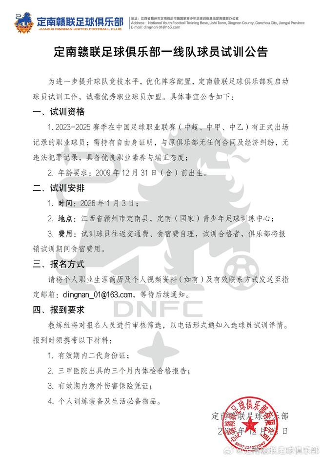 一周前,中国足协公布了新赛季进入联赛后首批完成偿债的俱乐部名单。这意味着新赛季的进入已经进入冲刺阶段。尚未出现在债务清偿名单上的俱乐部需要迅速开展工作,争取下一批清偿;完成债务偿还的俱乐部还需要准备其他准入材料,以确保能够获得准入许可。其中,位于中甲联赛的定南甘联成功出现在第一批已完成的付款名单中。随后,他们迅速宣布与一线队进行球员试训,并开始新赛季的球员选拔工作。由于球队原主教练刘建业履新,出任中超升班马重庆铜梁龙队主帅,而新任主教练毛飚也已到任,本次试训应由由新任主教练毛飚主帅。他将结合球队目前的情况和个人的执教思路,挑选适合新阵容体系的球员,从而优化阵容配置,打好新赛季的中甲联赛。与很多球队的试训公告不同,定南赣西联的试训仅设定了较低的年龄限制,即要求试训球员出生于2009年12月31日之前;但没有年龄上限,这意味着退伍军人,包括80后,都有机会进行练习测试。当然,本次试训公告的另一个不同之处在于,试训球员必须拥有2023-2025赛季三级职业足球联赛(中超、中甲、中乙)的正式出场记录。这意味着拥有职业联赛出场时间甚至经验丰富的球员将拥有更大的竞技优势塔格。这篇文章估计会把很多玩家挡在门外。此外,和大多数俱乐部一样,定南甘联也要求试训球员持有自由球员证书,并且与原俱乐部没有合同或财务纠纷。定南甘联的前身是成立于2014年的安徽力天,2015年底,俱乐部更名为黑龙江霍山明泉,并迁至哈尔滨。 2021年更名为黑龙江冰城。2025年1月,俱乐部搬迁至江西赣州定南,并更名为定南甘联,从而开启新的绿色篇章。 2025年刚刚结束的赛季,征战中甲的定南赣西联最终取得11胜11平8负的战绩,打进40球,打进35球,积44分,排名中甲积分榜第六位。新赛季,在新帅毛飚的带领下,开启第二年定南之旅的球队将会取得怎样的成绩?乐等等。